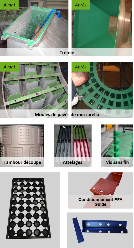 We can also address problems of sticking, abrasion, sealing, removing from moulds, contact with confectionery, bakery, patisserie, industrial seasoning, cheese, catering products, etc.